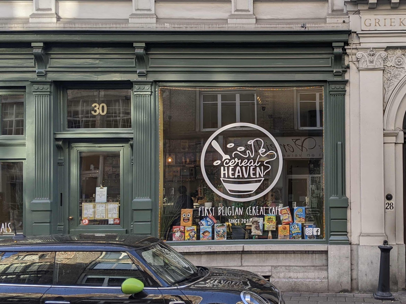 We agreed to meet at noon, when Cafe Ernst opened. On the way I passed Cereal Heaven — the First Belgian Ceral Cafe. If you just have to have your fix of Captain Crunch or CocoPuffs this is the place to go. I guess there is a market for everything.
